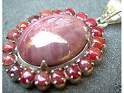 Jabberjewelry.com has this unique very very large ruby agate silver pendant large movable bail opening 9 x 14 mm open back to view stones front stone high polished lovely sheen on this stone opaque stamped 925 on bail back this stone is man made measures 2 1/2" drop from the top of the bail 1 1/2" wide center stone measures 25 x 30 mm oval cabochon smaller ovals 7 x 5 mm and 6 mm rounds all cabochon cut 12 mm thick high polished heavy pendant weight of 38 grams great gift item. Shipping $6.50. Retail Price $79.00 Our Price $33.50 Item # 11678 Jabberjewelry.com