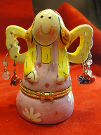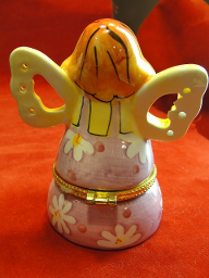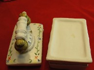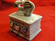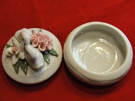 birthday cake style trinket box is made of porcelain and the colors are pale pink green gold and white 3 flowers come right out the top white with brushed pink on them well made green painted on leaves and gold dot like trim on the top and bottom pale pink around the side of the cake like trinket box 3 1/2" round 2 1/4" tall 1" deep in bottom and 1/4" deep in top very unique box great gift item. Item #11664 Price $13.50 Shipping $6.50.Jabberjewelry.com Trinket Boxes.
